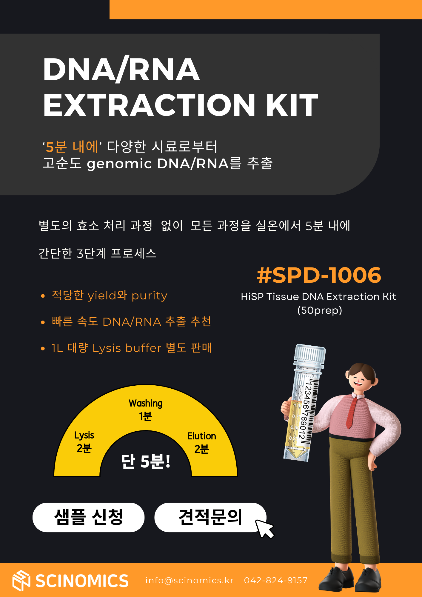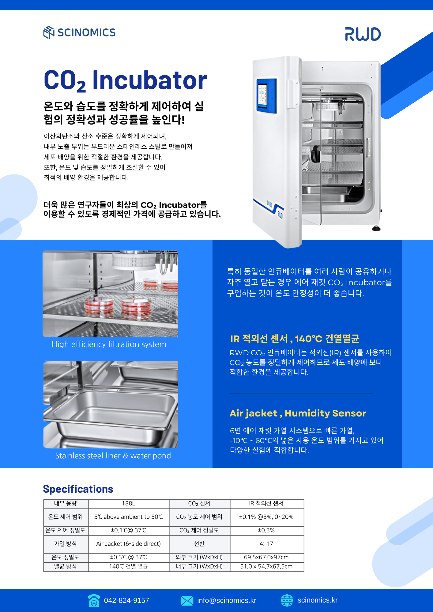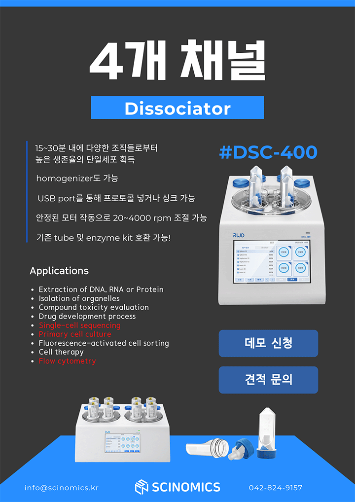 RWD 자동 조직 단세포분리기 Dissociator. 4개의 독립 채널로 빠른 시간에손상 없이 조직으로부터 세포를 분리! Read more MINI GEL DOC SYSTEM GELCUBE CYAN. EtBr, Safe dye 검출이 가능한 Cyan 광원에Trans-white 탑재로 염색한 PAGE gel까지 확인 가능! Read more CO₂ Incubator. 6면 air-jacket 가열방식IR 센서로 정확한 CO₂ 농도 모니터링Humidity probe 내장140℃ 고온멸균 시스템내부 HEPA filter 내장 Read more Western, 이제 하루면 됩니다! Antibody와 항원(단백질)의 반응을 도와Antibody 사용량을 줄여주는 Antibody Binder. Read more Features 뉴스레터 신청하시면 신제품 및 할인 정보를 보내드립니다. 신청 되었습니다. Name Email Submit Call (042) 824-9157 Fax (042) 824-9158 Email info@scinomics.kr Address 대전광역시 유성구 복용로40번길 5-6, 101