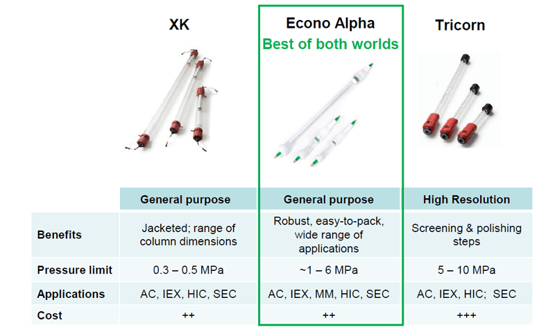 Econo Alpha Columns, our new range of empty column hardware for low- to medium-pressure chromatography. These columns are convenient, easy-to-pack and compatible with NGC Systems and other chromatography systems. The fully assembled columns are available in a range of dimensions to fit your applications.