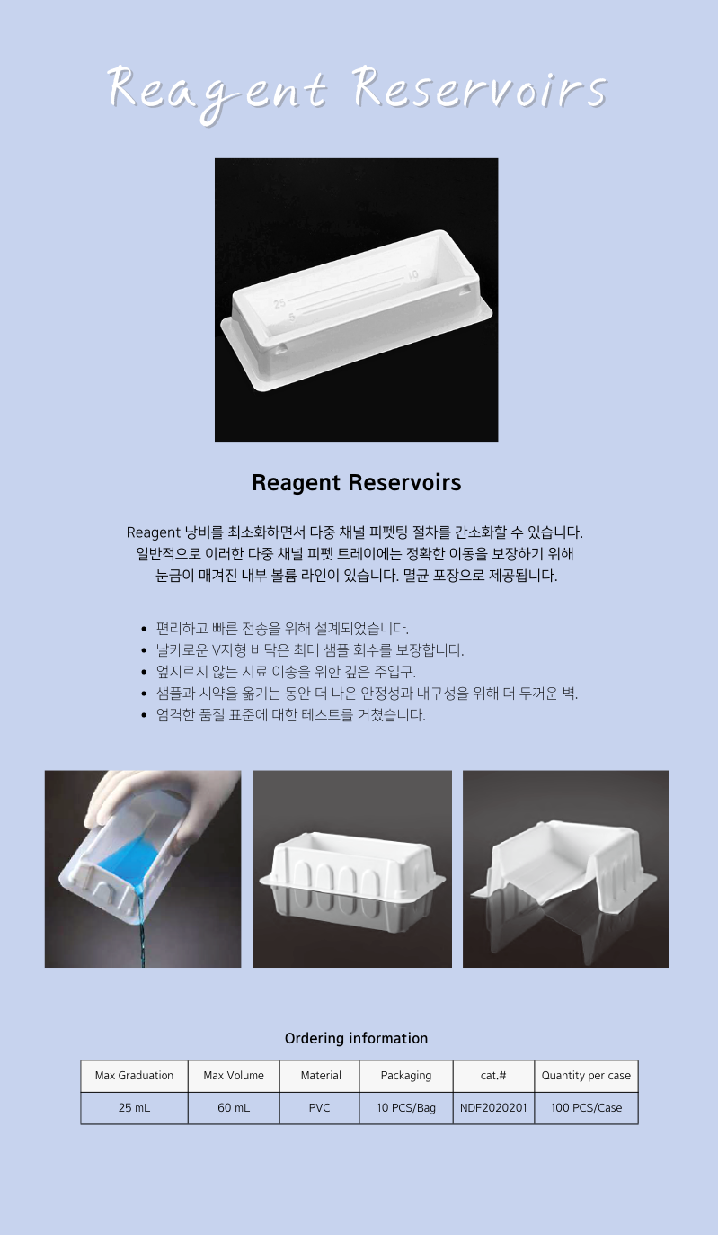 You can use reagent reservoirs to streamline multi-channel pipetting procedures while minimizing the waste. Usually, these multichannel pipette trays have internal graduated volume lines to ensure accurate transfers. They often come in sterile and non-sterile packaging.