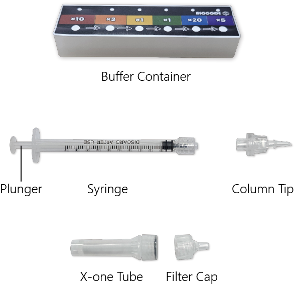 X-one Easy Kit는 Syringe와 Column tip, Buffer container로 구성되어, 각 단계마다 Syringe를 이용하여 펌핑을 하고 이 단계가 centrifuge를 모두 대체합니다.