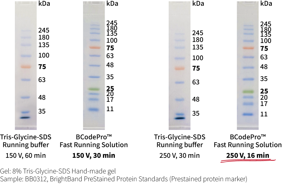 전기영동의 속도는 ionic strength와 크게 관련이 있습니다. BCodePro™ Fast Running Solution은 기존의 Tris-Glycine system보다 이온 강도가 높아서 전류가 더 많이 흐르게 되고, 고전압 (최대 250 V)에서도 전기영동이 안정적입니다.