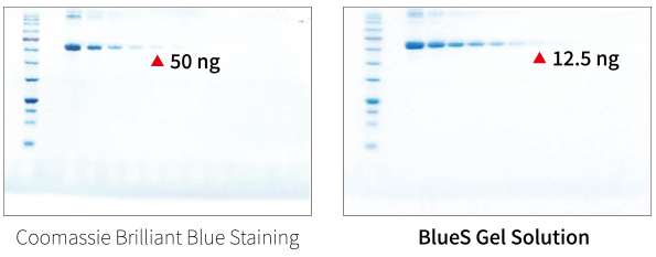 기존 CBB 염색(약 50 ng 감도)보다 높은 감도로, 희석된 시료나 미량 단백질도 놓치지 않습니다.