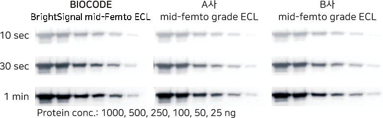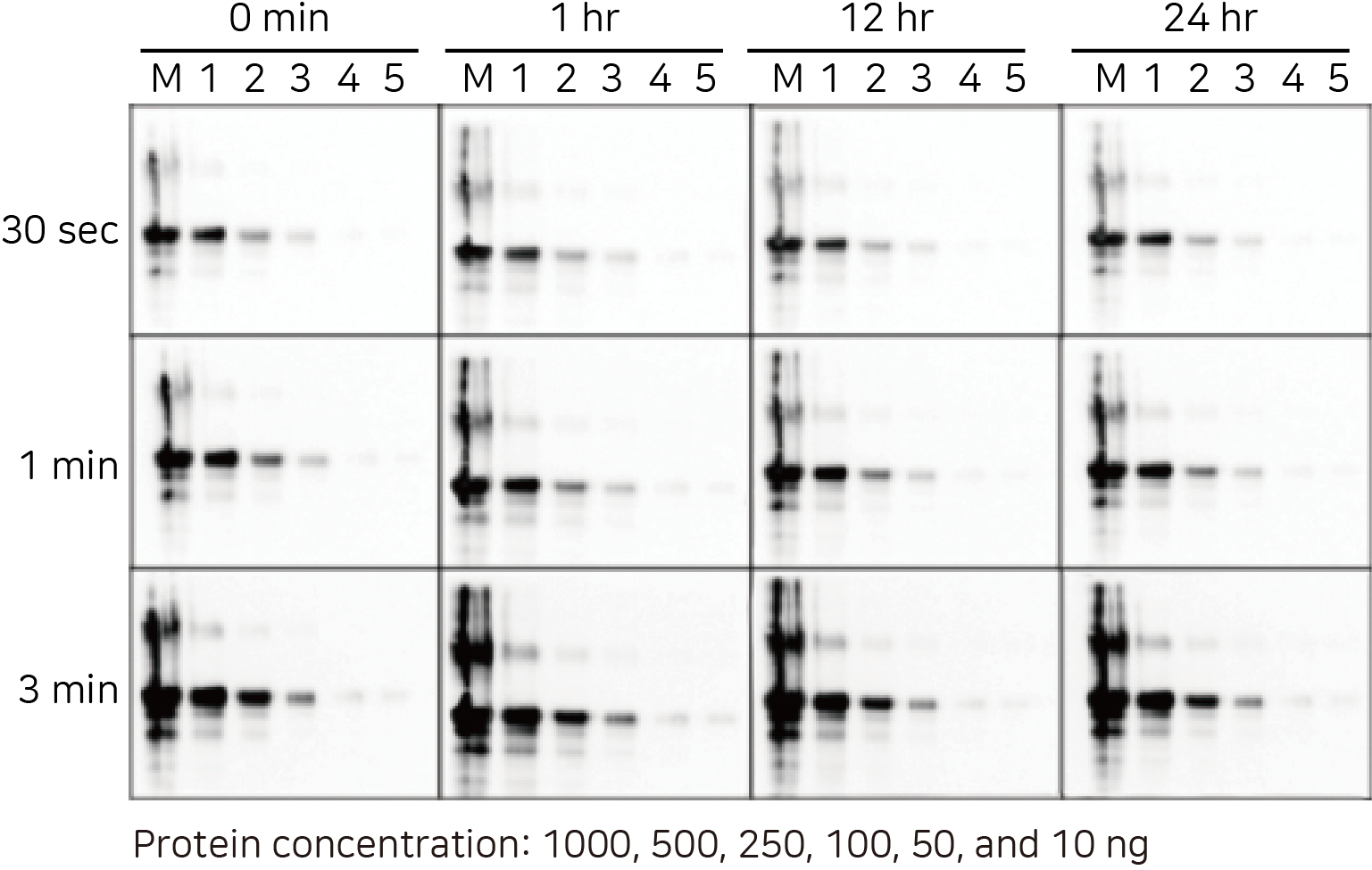 ECL Solution: BrightSignal Pico ECL Solution을 1:1 희석하여 400 μL 처리한 후 촬영, 4℃ 보관하여 1시간 후, 12시간 후, 24시간 후에 촬영