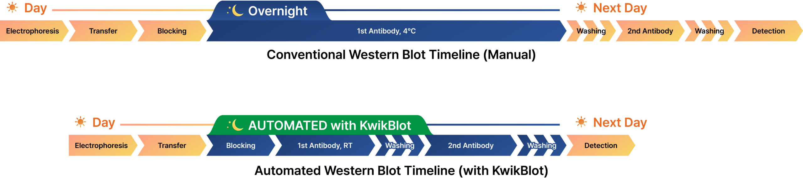 기존의 진공 기반 자동화 시스템과 달리, KwikBlot은 기존 수동 실험과 동일한 incubation 시간과 gentle agitation 방식을 유지하여 background 증가 없이 신뢰도 높은 blot 결과를 제공합니다.