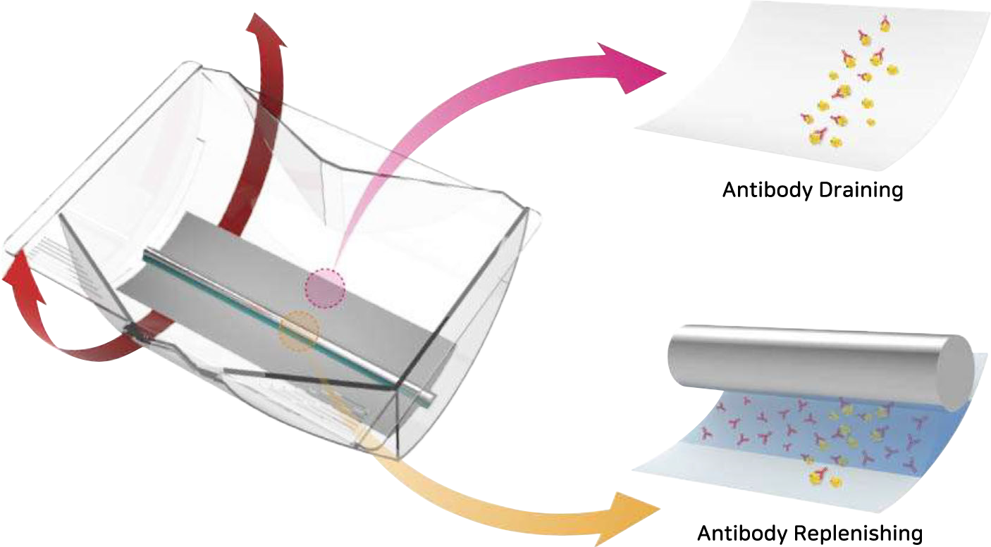 기존의 seesaw shaker 위에 tray를 올려 Antibody를 반응하는 Batch방식은 항체를 반응하는 동안 항체의 농도가 낮아진 얇은 층이 Blotting membrane 주위에 생성되어 항체 결합을 제한합니다. 하지만 이 층은 항체 용액의 순환 배수 (Draining) 및 보충 (Replenishing)에 의해 쉽게 파괴될 수 있습니다.