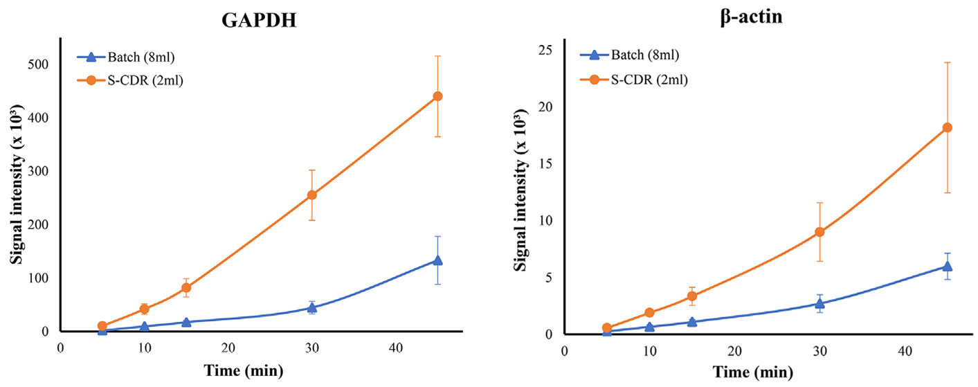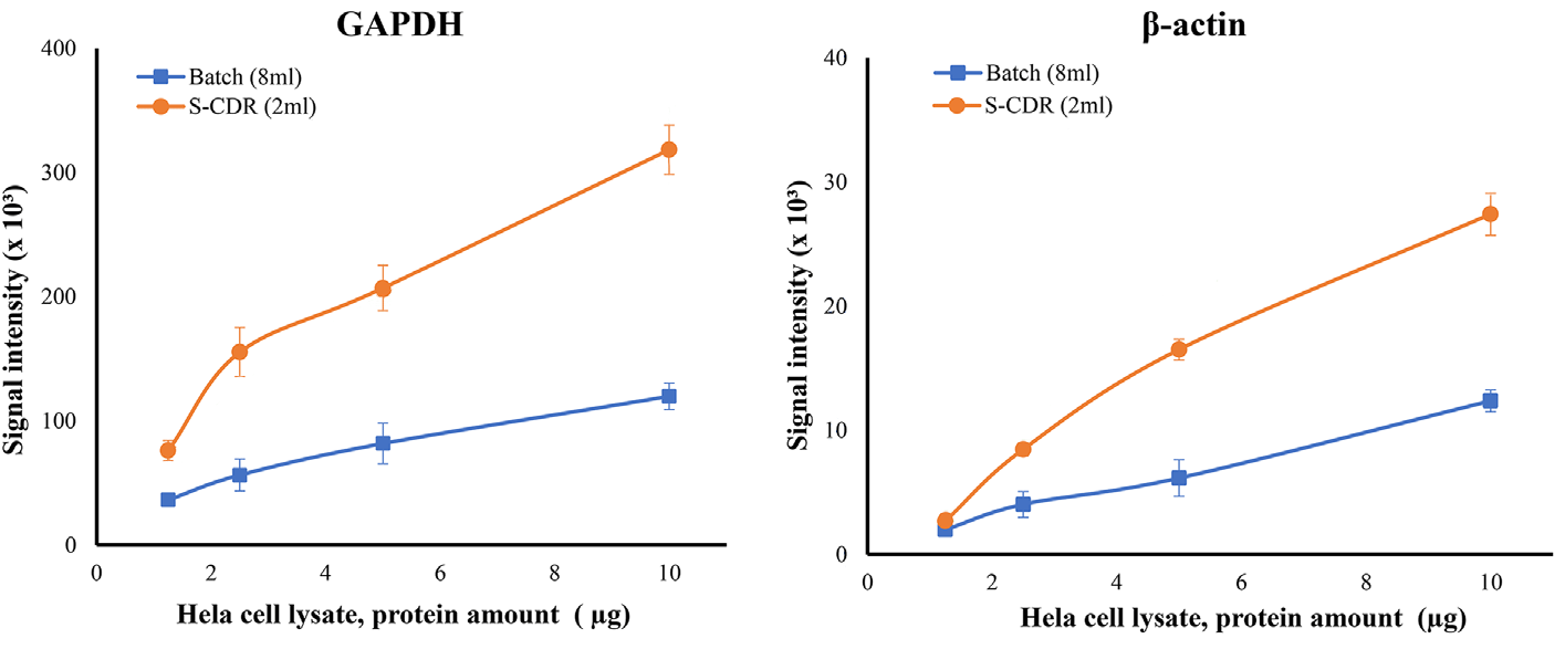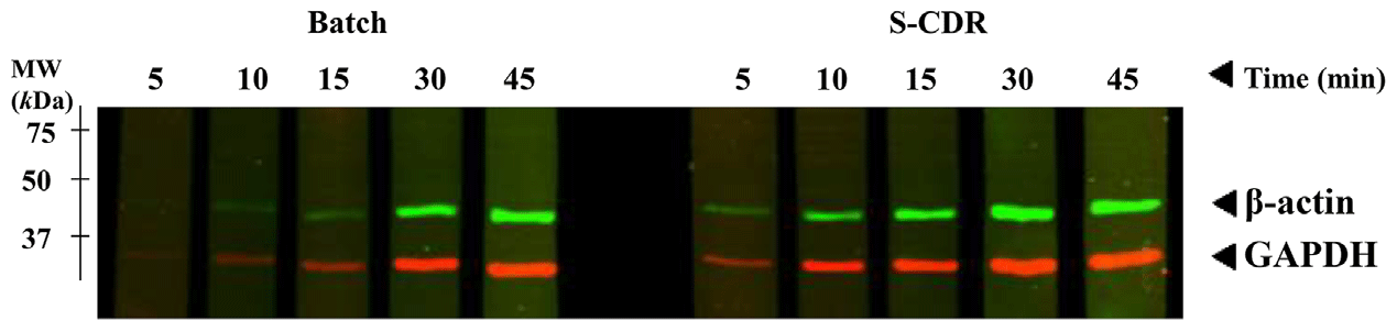 항체 처리 시간에 따른 Batch방식과 S-CDR 방식의 결과 차이
